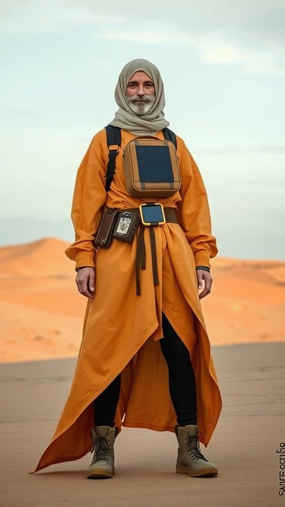 "Craft a visionary fashion concept that fuses cutting-edge aesthetics with nomadic traditions, envisioning garments that harmoniously integrate practicality with elegance. This collection features innovative materials like adaptive textiles and smart fabrics that respond to environmental changes, maintaining comfort across diverse climates. The bold silhouettes draw inspiration from traditional nomadic robes and tunics, reimagined with asymmetrical cuts and layers that allow ease of movement. High-tech accessories such as solar-powered backpacks and multifunctional belts enhance the nomadic experience, enabling wearers to harness energy and connectivity on the go. Each piece is designed to cater to a society where mobility and technology are seamlessly intertwined, offering style-savvy travelers the freedom to explore while staying connected."