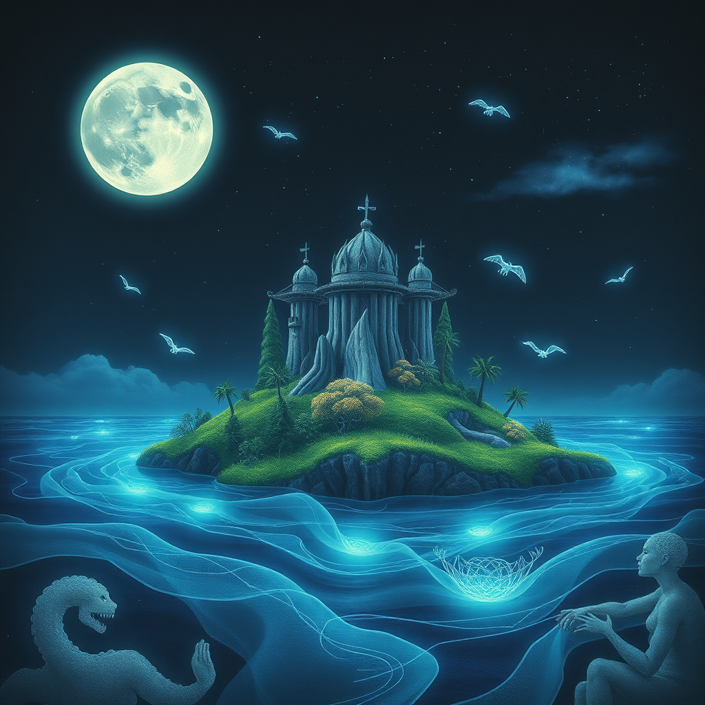 Craft an imaginative narrative about a mysterious island that appears every full moon, where the flora and fauna exhibit unique bioluminescent properties, and the air is filled with enchanting melodies from unseen, ethereal creatures.