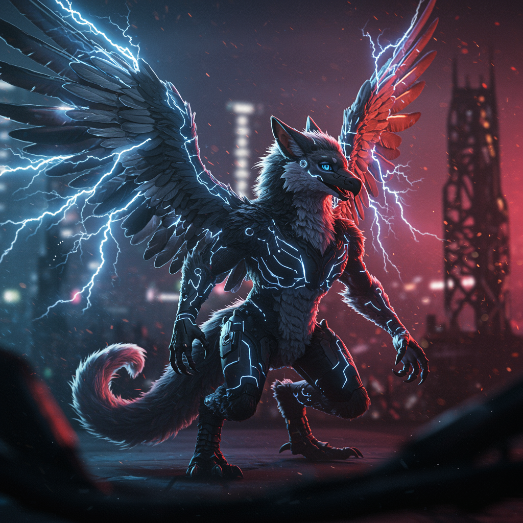 A stunningly crafted gay male protogen fursona merges with a thunderbird, featuring electrifying lightning wings and a cyberpunk-inspired headshot. The image captures a dramatic and cinematic essence, highlighted by glow effects and vivid sci-fi elements. In the background, mecha structures and a vibrant cityscape create an atmosphere of futuristic allure. The fursona's intricate design is showcased in sharp focus, enriched with breathtaking bokeh and vivid colors. Rendered in 16k UHD, the scene is enhanced with HDR10 quality, presenting absurdres-level detail. This fusion of organic and mechanical aesthetics presents a compelling vision of Lyriel v. 1.5, where creativity meets high-tech elegance in a dynamic, futuristic tableau.
