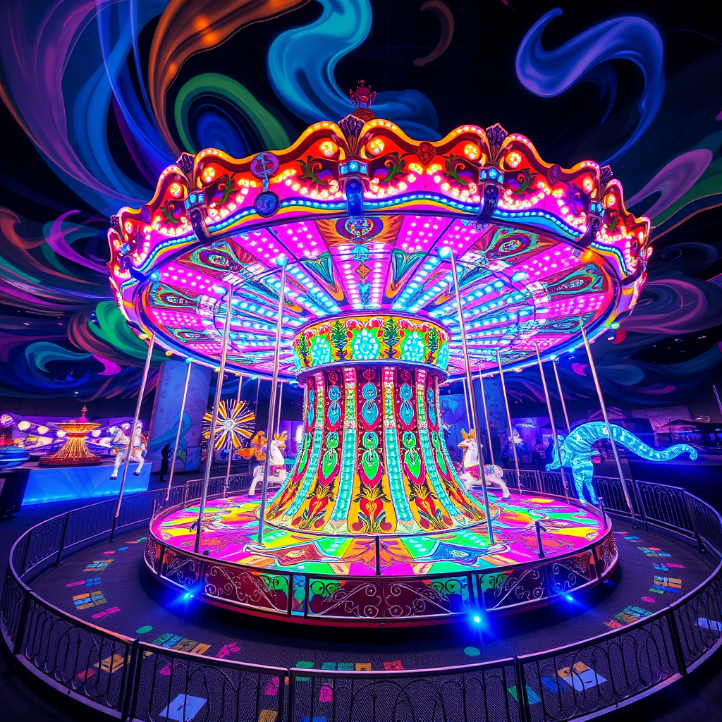 "Crafting a kaleidoscope of carousels spinning through diverse dimensions, each one a vivid whirlwind of color and imagination, where every ride offers a new universe of possibilities and dreams intertwined."