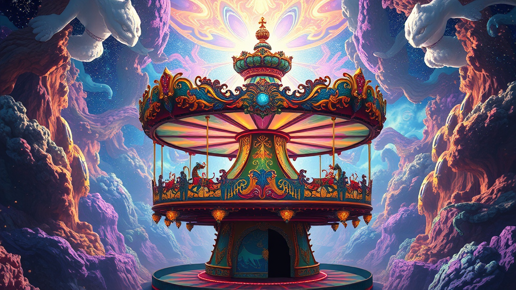 Crafting a kaleidoscope of interconnected worlds, envision a carousel that spins through vibrant multiverse realms, each platform twirling with unique landscapes, fantastical creatures, and vivid colors, weaving stories of infinite possibilities as it rotates through dimensions.