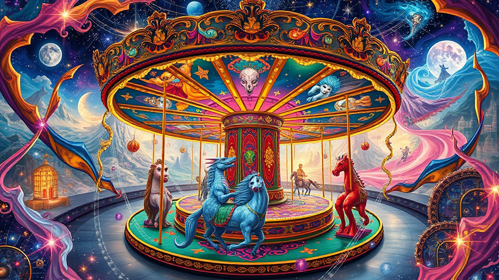 Crafting a universe of spinning carousels, where each rotation unveils a new world filled with vibrant colors, fantastical creatures, and ever-shifting landscapes, all interconnected through swirling portals of light and dreams.