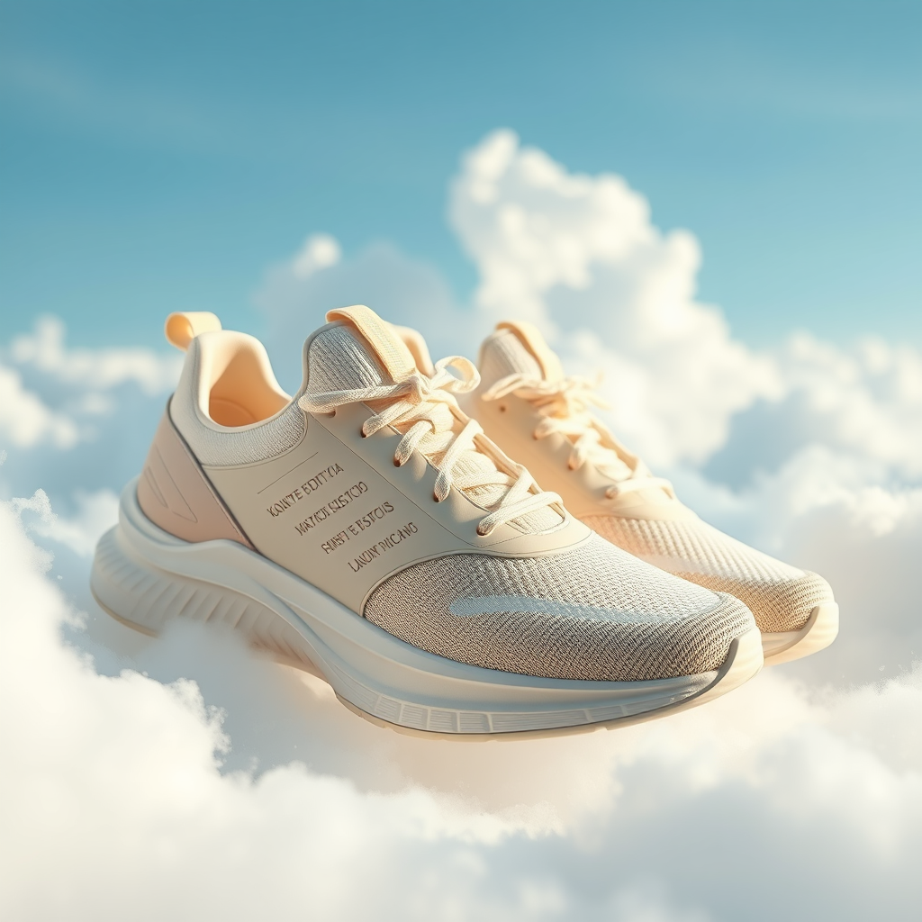 Cream color palette running sneakers designed by Kanye West and Jacquemus, featuring a sleek, luxury aesthetic, with subtle hints of gold accents. Set against a backdrop of soft, dreamy blue clouds, slightly dispersed to mimic ethereal wisps in the sky. Enhanced by volumetric lighting to give a celestial glow, the scene is rendered in octane for a high-definition, 8k product shot. The intricate details of the sneakers, including delicate stitching patterns and unique material textures, create a sense of elegant sophistication.