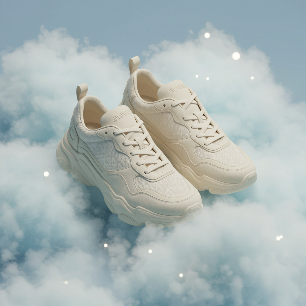 Cream-colored luxury running sneakers designed by Kanye West and Jacquemus featuring elegant and intricate details, set against a fluffy pale blue cloud-shaped backdrop with soft, volumetric lighting. Rendered in Octane at high 8k resolution, these sneakers capture a sense of refined sophistication and elegance, with each element thoughtfully crafted to showcase their unique design. Subtle reflective accents and textured surfaces enhance the visual appeal of the sneakers, creating a harmonious blend of style and innovation.