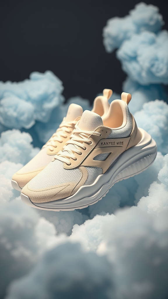Cream-colored luxury running sneakers designed collaboratively by Kanye West and Jacquemus, featuring elegant and sophisticated aesthetics, set against a backdrop of fluffy blue cloud shapes. Illuminated with volumetric lighting and captured in an octane render, this product shot emphasizes the sneakers' high level of detail and intricate craftsmanship, presented in stunning 8k resolution.