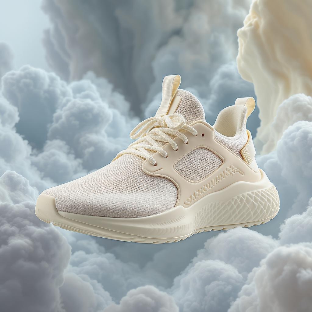 Cream-colored palette running sneakers, inspired by the collaborative designs of Kanye West and Jacquemus, embody elegance and luxury. Set against a backdrop of soft, fluffy blue cloud formations, the scene is illuminated by volumetric lighting to enhance the sneakers' intricate and high-detail design. The shoes display subtle textural elements, reminiscent of natural forms, in a stunning Octane-rendered product shot, presented in 8k resolution for an unparalleled visual experience. Pepper in hints of metallic accents to add a modern edge while maintaining the core aesthetic of sophisticated simplicity.