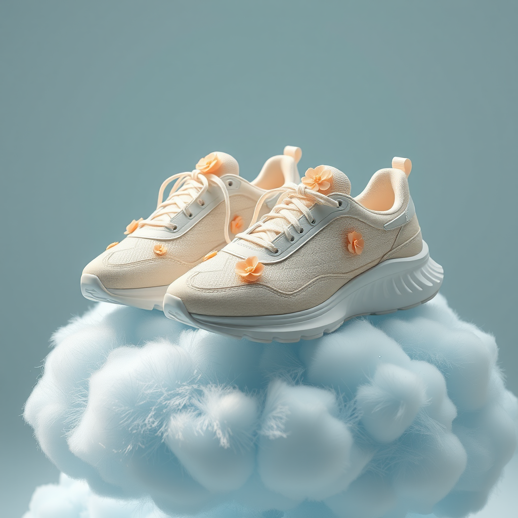 Cream-colored running sneakers designed by Kanye West and Jacquemus, adorned with intricate, hand-stitched floral motifs, perched atop a soft, fluffy blue cloud shape with subtle, wispy edges, set against a dreamlike, volumetric lighting scenario, captured in exquisite 8K resolution and rendered with extraordinary detail in Octane, so that every seam, every stitch, and every accidental drop of dew appears resplendent in high-relief.