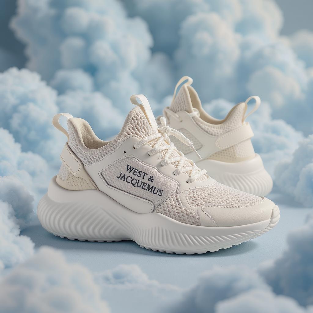 Cream-toned running sneakers designed collaboratively by Kanye West and Jacquemus, epitomizing elegance and luxury, set against a backdrop of fluffy blue cloud formations. The scene is illuminated with soft, volumetric lighting for a dreamy effect, captured in an octane render style. This product shot showcases the intricate and high-detail design of the sneakers in 8k resolution, offering a seamless blend of contemporary fashion and ethereal aesthetics. Subtle enhancements bring out the textures and contours of the sneakers while maintaining the core vision of modern opulence.