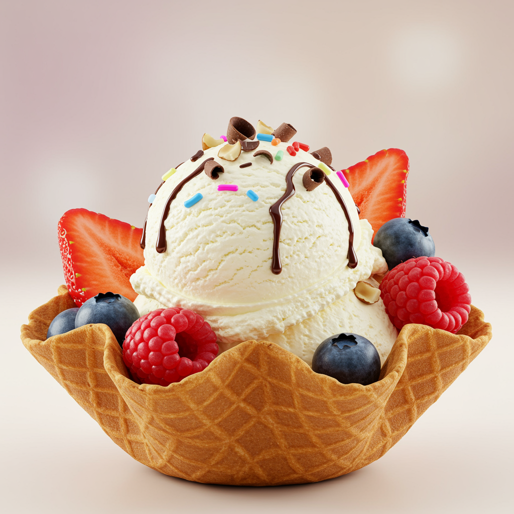 Creamy ice cream nestled in a golden waffle bowl shaped like a half moon, adorned with vibrant berries and an array of delectable toppings.