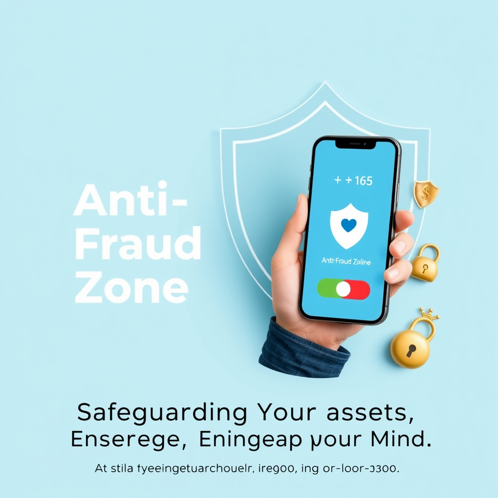 Create a banner for an anti-fraud awareness area with a light blue background featuring a transparent shield symbolizing security. On the left, there is a person making a phone call, with their hand representing a smartphone screen. The smartphone screen displays the anti-fraud hotline +165 next to a shield icon and a call button. Beside the person are elements such as a golden shield, a money bag, and a padlock. A bold headline on the left reads "Anti-Fraud Zone," and below it, a smaller subtitle reads "Safeguarding Your Assets, Ensuring Your Peace of Mind." Make slight creative changes while preserving the essence of the design.