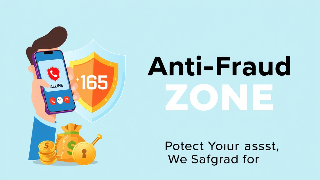 Create a banner for an anti-fraud awareness section with a light blue background and a transparent shield symbolizing safety. On the left, feature a character holding a phone with their hand, with the phone screen displaying the anti-fraud hotline +165 along with a shield and call button. Next to the character, incorporate elements like a golden shield, money bag, and padlock. Use a bold headline that reads "Anti-Fraud Zone" and a smaller subheading underneath stating "Protect Your Assets, We Safeguard for You." Add subtle creative touches to enhance the overall design while maintaining the core message.
