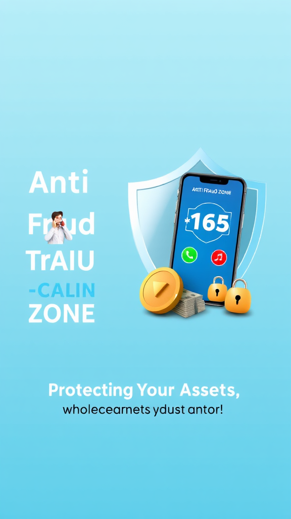 Create a banner for an anti-fraud promotion area with a light blue background that includes a transparent shield symbolizing security. On the left side, there is a character talking on the phone with a gesture indicating they are holding a smartphone. The smartphone screen displays the anti-fraud hotline +165 along with a shield and a call button. Next to the character, there are elements of a golden shield, a money bag, and a padlock. The main headline on the left reads "Anti-Fraud Zone," and the subheadline below says "Protecting Your Assets, Safeguarding Your Interests." Make slight creative adjustments while maintaining the essence of the original concept.