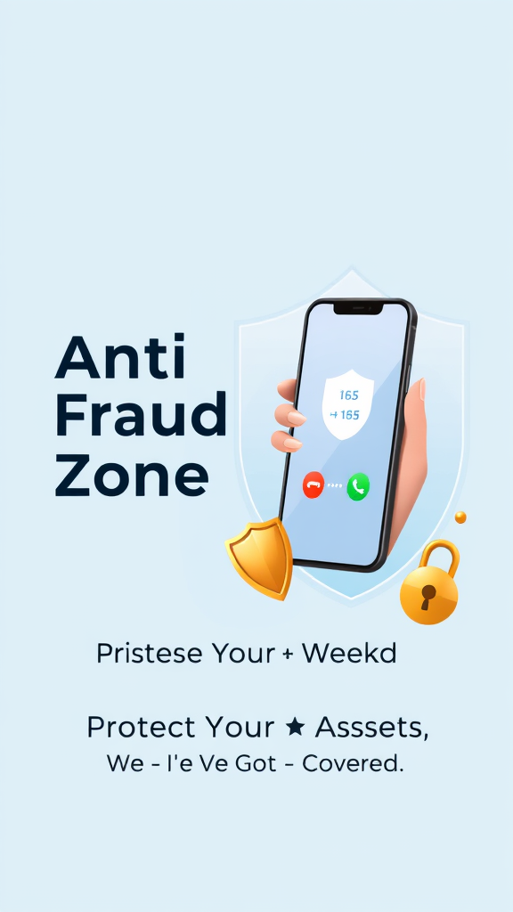 Create a banner for anti-fraud awareness with a light blue background and a transparent shield symbolizing safety. On the left, there's a character making a phone call, with their hand representing a smartphone screen. The phone screen displays the anti-fraud hotline +165 along with a shield and call button. Beside the character are elements like a golden shield, money bag, and lock. The large title on the left reads "Anti-Fraud Zone," with the smaller subtitle below stating "Protect Your Assets, We've Got You Covered." Add subtle creative touches while maintaining the main concept.