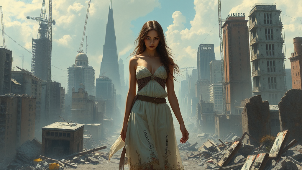 Create a breathtaking full-body portrayal of a female figure in a post-apocalyptic setting, capturing the essence of majestic beauty amid a ruined cityscape. Inspired by the intricate and detailed styles of master artists like Ed Blinkey, Atey Ghailan, Greg Manchess, Jeremy Mann, and Antonio Moro, this painting embodies the vibrant, emotive storytelling of a Studio Ghibli production. It should resonate with the trending aesthetics found on platforms like ArtStation and CGSociety, showcasing sharp focus and high detail. The scene is a dramatic, photorealistic masterpiece with a touch of surrealism—think disconnected limbs and intriguing proportions. Completed in a mixed-media style incorporating both oil painting and digital rendering techniques reminiscent of midjourney and Greg Rutkowski, the artwork channels a slightly animated, video game-like quality. Elements of the composition, such as text or abstract patterns, should subtly enhance the canvas without distracting from the centralized figure. The edges might fade or blur, inviting viewers to imagine beyond the frame, all while avoiding low resolution or repetitive tiling effects.