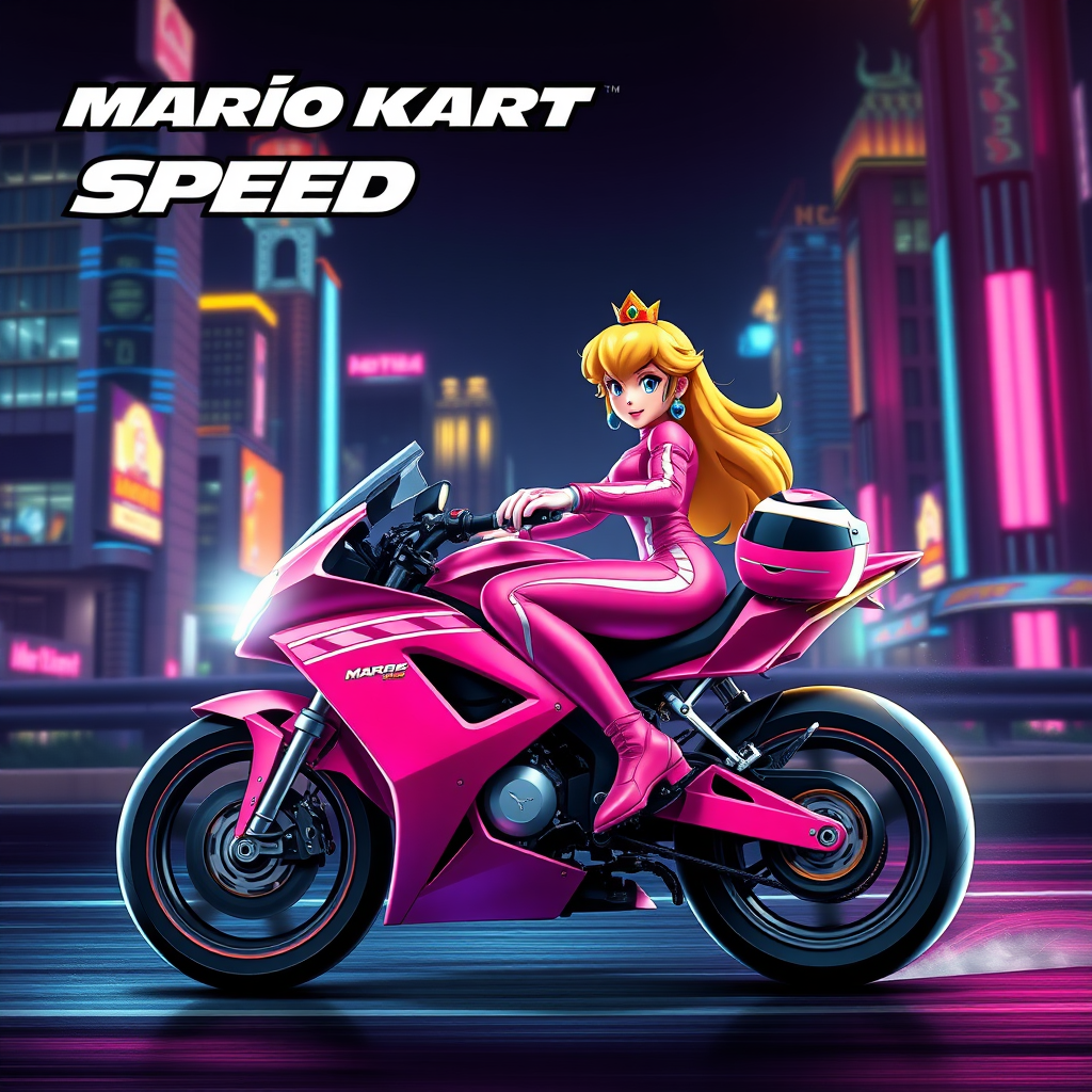 Create a breathtaking ultra-realistic illustration of Princess Peach riding a sleek pink racing bike inspired by Mario Kart, with a Fast and Furious flair. She's dressed in a chic pink sports suit with white trim, holding a matching helmet in her right hand. The backdrop is a nighttime cityscape, illuminated by vibrant neon lights, exuding a dark, fantasy vibe. The title "Mario Kart SPEED" is prominently displayed at the top, giving the image a cinematic feel. This high-resolution piece, with its striking typography, offers an unforgettable visual experience.