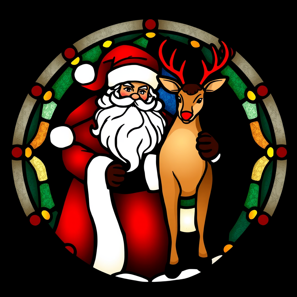 Create a captivating artistic illustration art piece that embodies the beauty of a flat gorgeous stained glass expression featuring Santa and Rudolph, centered around a Christmas theme with a golden ratio for perfect composition. Use simplified bold lines to craft a masterpiece against a matte black background that exudes a festive Christmas mood. Incorporate subtle creative modifications to add uniqueness while maintaining the essence of the concept. Avoid realistic faces, 3D elements, side views, and intricate small details.