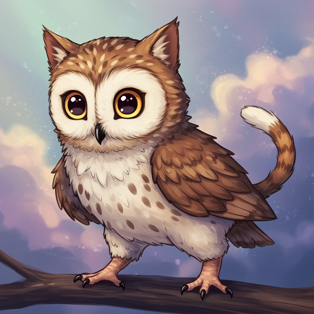 Create a captivating concept art of a whimsical creature featuring the enchanting fusion of an owl and a cat. This owl cat hybrid exudes cuteness and charm, blending the wise, inquisitive eyes and feathery plumage of an owl with the agile, playful grace of a cat. The artwork is an anime-style 2D painting, showcasing the creature in a dynamic pose that captures its lively spirit. The portrait features a full body image that highlights the harmonious blend of characteristics from both animals, set against a dreamy background. The color palette is vibrant and expressive, enhancing the creature’s mystical aura.