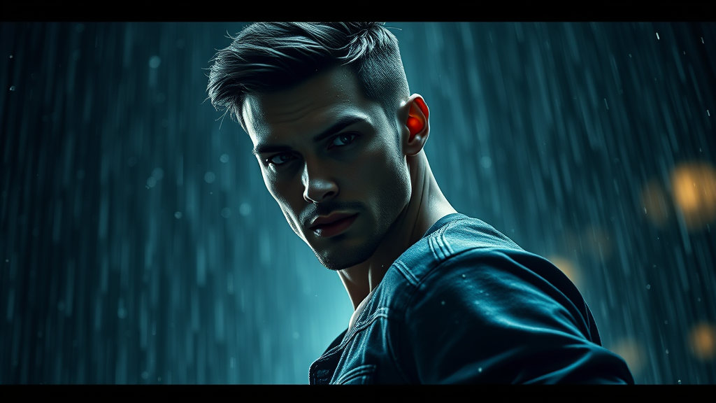 Create a captivating digital artwork featuring a soft, lustrous male hero in a dynamic action pose, captured in full-body 8k resolution. The scene is a blend of unity render with octane and artstation-style flair, showcasing intricate skin pores and a meticulously detailed face. The setting is enveloped in very dark lighting and heavy shadows, creating an atmosphere of intrigue and mystery. This masterpiece blends classical decadence with modern digital painting techniques, drawing inspiration from the artistic styles of Artgerm, WLOP, Ilya Kuvshinov, Greg Rutkowski, and Alphonse Mucha. The image features a hero clad in stylish blue jeans, standing amidst a heavy rain with particles gently floating in the dim light. The unique two-tone lighting adds depth and drama, accentuating features like facial markings and enhancing the texture of the scene. The artwork is given a monochrome, black-and-white tone with a subtle blur and haze for artistic effect. This 3D render has a smooth, sharp focus on the hero's face and form, with an emphasis on sculptural aesthetics akin to a finely crafted doll. Despite the soft lighting, details like flowers and other elements are meticulously illustrated. Unclear eyes add a mysterious allure, urging viewers to delve deeper into the character’s soul. The anatomy and proportions are expertly rendered to convey strength and grace, avoiding any elements that may detract from the hero's pristine form. Overall, this piece is free from distractions such as watermarks, logos, text, or artifacts, allowing for an immersive experience into this monochromatic, imaginative world.