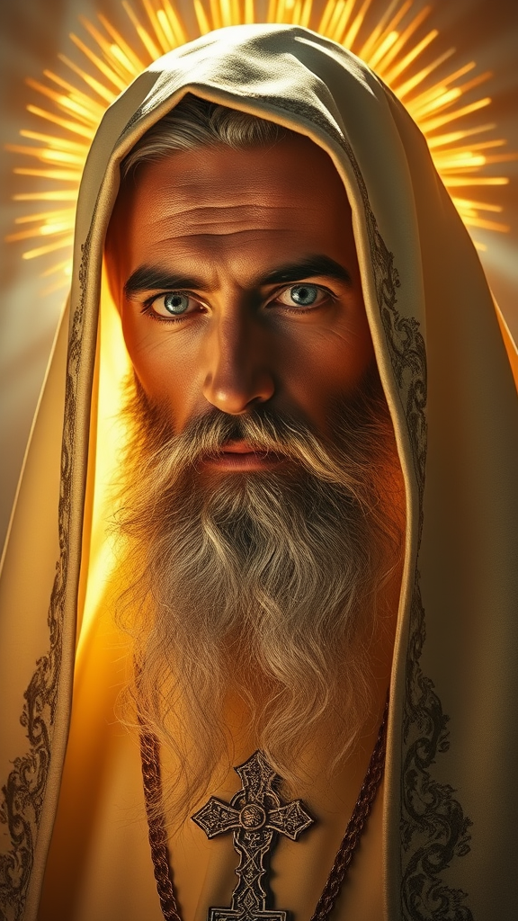 Create a captivating full portrait of a sacred priest bathed in holy light, focusing on ultra-high quality visuals and intricate details. The image should showcase perfect anatomy within a magical and divine ambiance, highlighting a beautiful face framed with golden hues. Despite the stunning effect and a 3D canvas quality, introduce subtle elements of surrealism with unusual color blends. Maintain a sense of mystique with slight imperfections in proportions, hinting at extra features. The overall scene suggests a blend of divine elegance and subtle distortion, balancing beauty with a touch of the surreal.