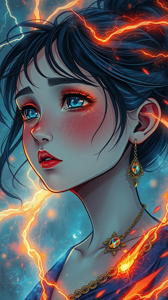 Create a captivating portrait of a young girl enveloped in mystical elements of lightning, fire, ice, water, and wind. Channeling the essence of detailed dreamscapes, the scene should burst with vibrant, glowing colors, evoking the mysterious allure of a nocturnal world. The girl's face, marked by the grime of magic, contrasts with ethereal iridescent and opalescent wires adorning her, along with intricate earrings. Despite an imperfect and natural look including skin spots and blemishes, her presence is powerful. The composition captures her elongated neck, embracing a blend of styles reminiscent of 3D, cartoon, and anime influences, complemented by refined sketches. The artwork is a testament to raw beauty, harmoniously combining elements that might suggest an aura of imperfection, like a luminescent beauty amidst a chaotic yet enthralling magical storm.
