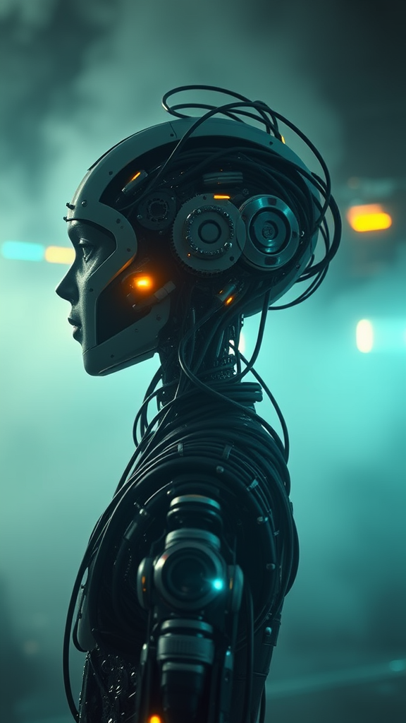 Create a cinematic side view of a semi-organic entity intertwined with intricate machinery, showcasing an ultra-detailed robotic facade. The figure gazes into the distance, set against a sci-fi backdrop that is both fog-laden and dimly lit. The atmosphere is accentuated with cyan and yellow glows, casting dramatic contrasts, enhanced by RTX shaders and hyper-detailed textures that capture reflections. Elements of high dynamic range imaging (HDRI) enhance the scene, featuring a cyborg aesthetic laced with grunge and bolts. The composition adheres to a UHD format, with a chaos level subtly dialed to 1.3, presented in a 9:16 aspect ratio. The style is raw yet polished, with a stylization level of 750, maintaining the core essence yet embracing subtle creative deviations.