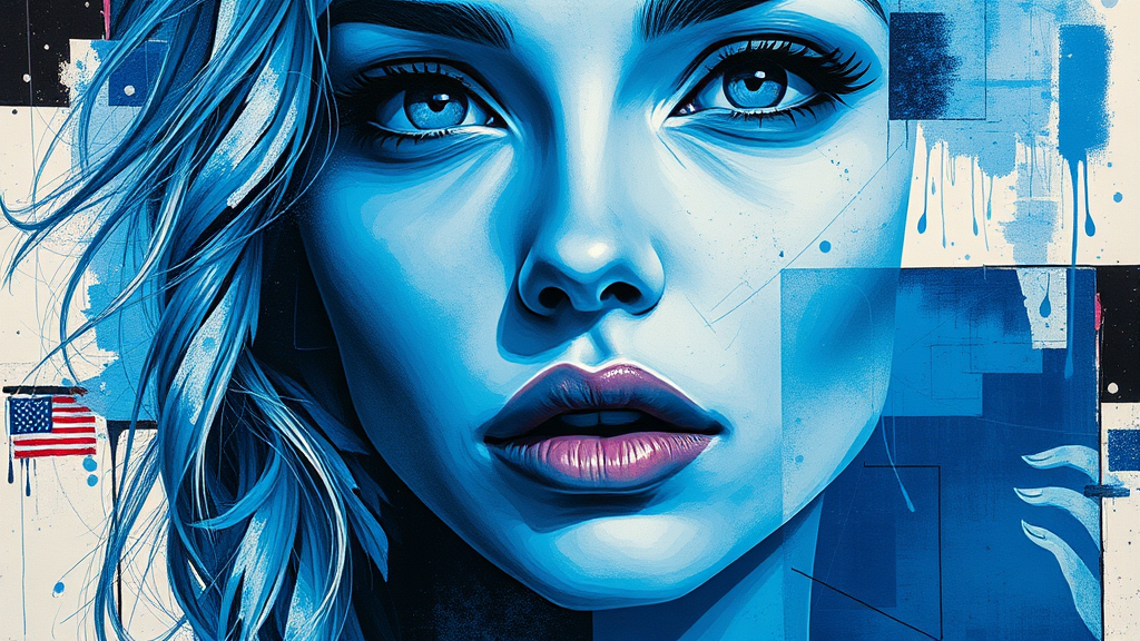 Create a collage of a woman's face featuring a blend of cyan and blue tones, inspired by the styles of Josef Kote and Dain Yoon. Incorporate grunge beauty with highly detailed realism, showcasing multi-layered compositions reminiscent of Antonio Mancini. The artwork should capture a dynamic fusion of expressive abstract elements with a modern twist, focusing on unique textures and intricate patterns to bring a vivid, imaginative portrait to life.