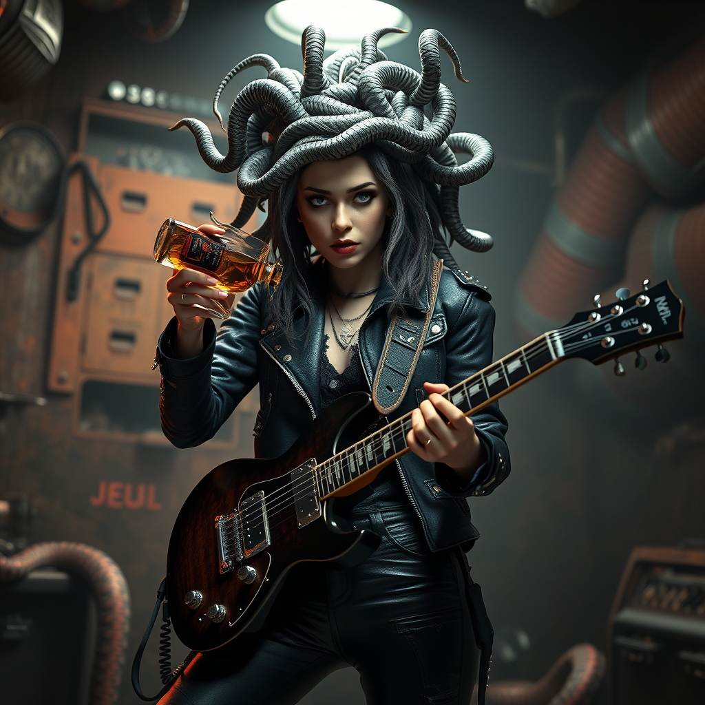 Create a conceptual 3D render image of a rebellious punk Medusa, the legendary Gorgon of Greek mythology, showcasing her disheveled snake hair. In an informal and bold pose, she's wearing a studded leather jacket, strumming an electric guitar with fiery passion while casually sipping whiskey straight from the bottle. The setting captures a gritty, underground vibe with a spotlight on her dynamic presence, as the snakes animate around her in sync with the music. Rendered in stunning photorealism and rich detail, trending at ArtStation in both 8K and 4K resolutions using octane render, maintaining the mythological essence with a modern punk twist.