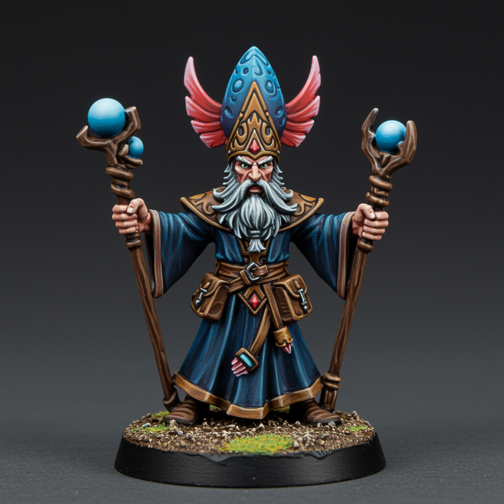 Create a detailed and intricate painted miniature of a wizard standing on a base, focusing on character design with sharp focus and rich detail. The wizard should have an expressive and dramatic pose, with elaborate and photorealistic headpieces that capture attention. The artwork should have a whimsical and imaginative cartoonish feel, with vibrant colors and a touch of magical realism. The wizard's eyes should be open, conveying a sense of wisdom and mystery.