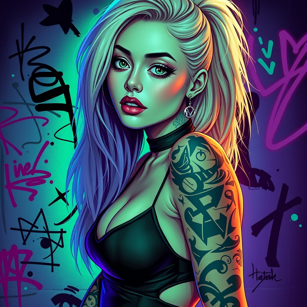 Create a detailed portrait of a blonde tattooed girl wearing a mini dress, inspired by the styles of Atey Ghailan, Greg Rutkowski, Greg Tocchini, James Gilleard, Joe Fenton, and Kaethe Butcher. Use a gradient color scheme of green, black, purple, and neon hues to capture a grunge aesthetic. Place her against a graffiti-tagged nightclub wall for the background. Avoid low resolution, text errors, or any qualities that detract from the image's impact, such as poor anatomy or disfigured proportions. Keep the focus on a vibrant, edgy, and dynamic portrayal.