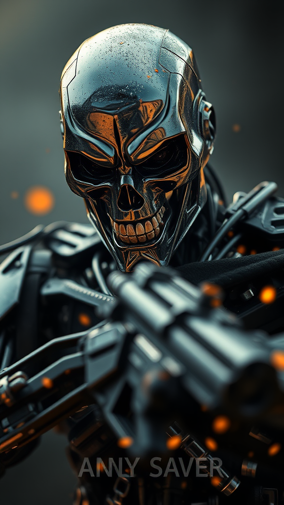 Create a dramatic and action-packed terminator. Use advanced photography and image editing techniques to realistically capture intense expression and posture, playing with light and shadow to add depth and drama to the image. Incorporate elements of the battlefield, such as debris and destruction, to add context and visual interest. Ensure the image has high resolution and impeccable image quality for a very realistic and dynamic appearance.