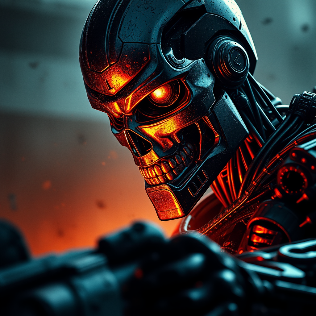 Create a dramatic and action-packed terminator using advanced photography and image editing techniques to capture a realistic, intense expression and dynamic posture. Utilize light and shadow to add depth and drama, incorporating elements of the battlefield like debris and destruction for context and interest. Ensure the image has high resolution and impeccable image quality for a realistic and dynamic 3D appearance. Include elements such as the terminator's mechanical details and battle-worn armor, with attention to realistic textures and reflections from the environment. Add subtle creative modifications to enhance the scene while maintaining realism and the core concept of a futuristic, battle-hardened terminator in an epic confrontation.