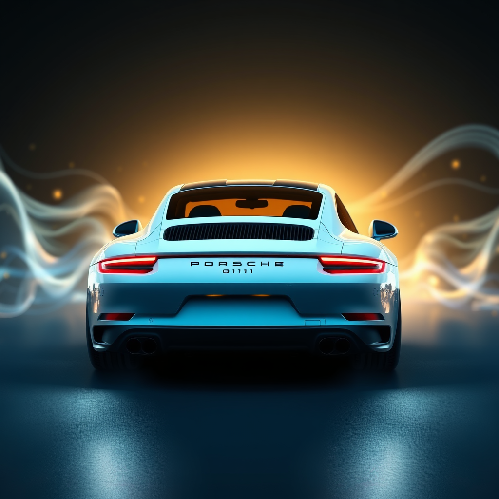 Create a dynamic 3D digital artwork featuring a backlit Porsche 911, emphasizing a sleek black, white, and blue color scheme. Incorporate abstract fluid forms and sharp lines within a CGI environment, utilizing depth of field, advanced shaders, and RTX capabilities. The scene should be illuminated with volumetric light, rendered with octane for a smooth finish, designed to serve as a stunning widescreen wallpaper. Add a touch of creative chaos and detail with intricate surface textures, maintaining a cinematic quality.