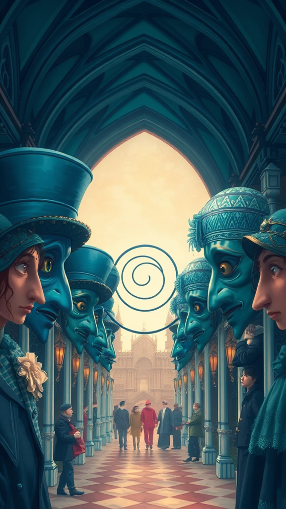 Create a fantastical composition of a Venice carnival scene, featuring vibrant, eye-catching colors with a focus on navy and aquamarine hues. The arrangement is symmetrical, showcasing individuals with distinctive, prominent noses amidst gothic-inspired architecture. A spiral formation draws the eye, enhancing the expressive nature of the scene. This art piece captures the whimsical and enchanting atmosphere of the carnival with a touch of anime influence.