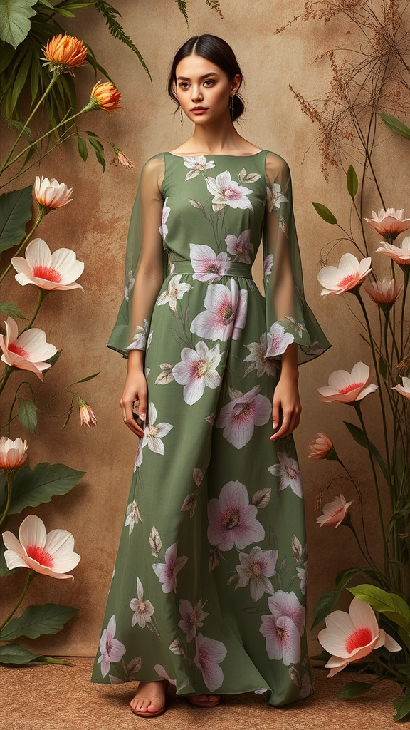 "Create a fashion collection that embodies the elegance of botanical elements, featuring designs with intricate floral patterns and organic textures. Utilize a natural color palette inspired by blooming gardens and lush landscapes, incorporating shades of deep green, soft lavender, and earthy terracotta. The garments should flow with the grace of nature, using lightweight, sustainable fabrics and innovative cuts that mimic the fluidity of petals in the breeze. This collection captures the sophisticated yet understated essence of nature, offering a modern twist on classic botanical motifs for a timeless look."