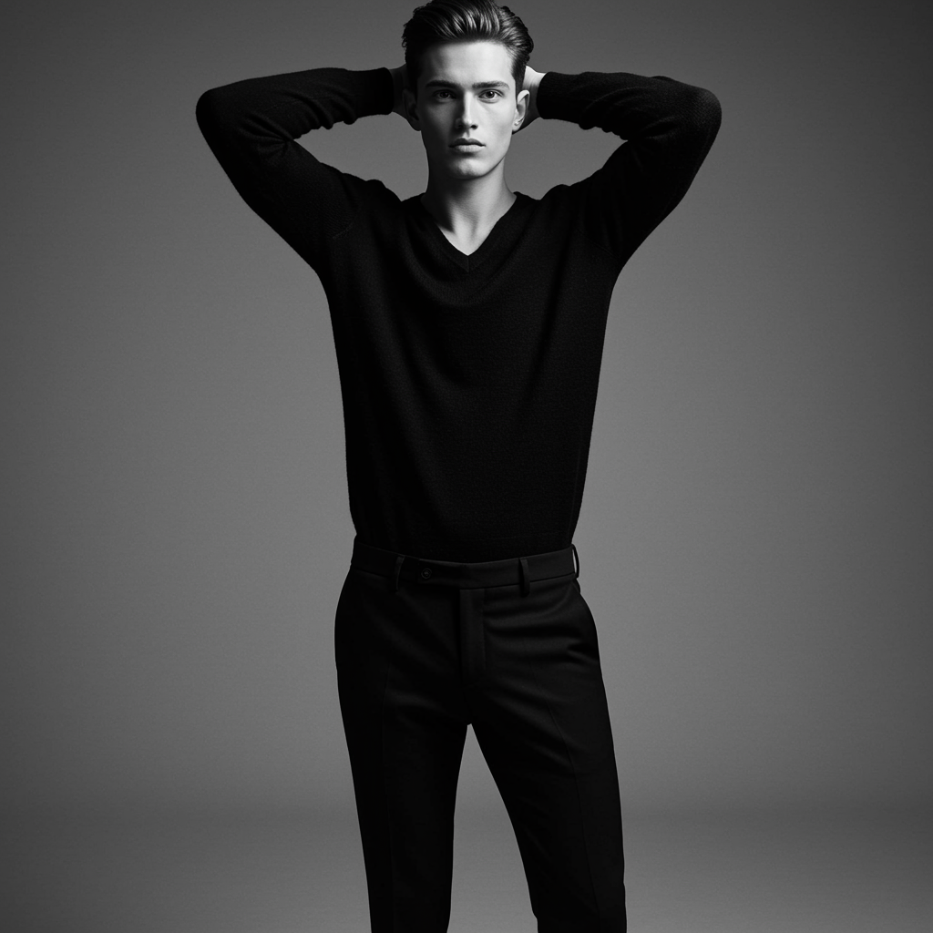 Create a full-body portrait of a male model in a self-assured and striking pose. He stands upright, hands loosely clasped behind his head, elbows out, exuding both ease and strength. He is clad in a tailored black v-neck sweater and slim black trousers, which emphasize his athletic physique. His expression is calm yet intense, with a gentle, contemplative knit to his brow, adding a compelling depth to his eyes. The lighting is subdued and strategic, accentuating the contours of his face and the intricacies of his clothing. The backdrop is minimalistic and clean, ensuring all attention remains on him. A black and white filter envelops the scene, imparting a classic, timeless aura, while maintaining a crisp focus on the model from head to toe, devoid of color detail.