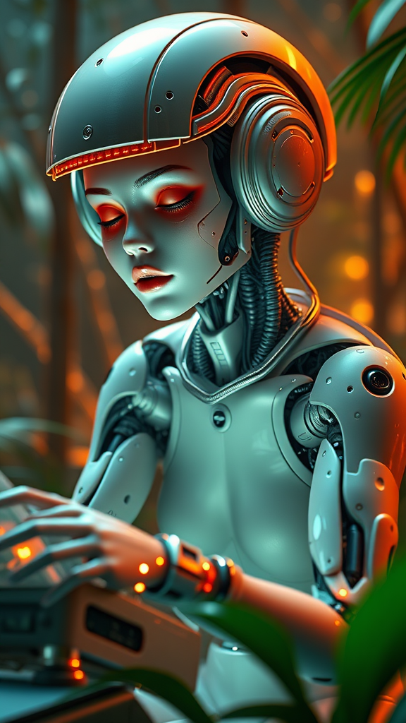 Create a full-body portrait of a stunning porcelain android, featuring a complex 3D render with ultra-detailed robotic parts. The face should reflect exquisite craftsmanship, combining elements of cyborg and anatomy with visible facial muscles, electric cables, and microchips. Set against an elegant, beautiful background, this hyperrealistic image should be illuminated with soft studio light and vibrant rim lighting, capturing the essence of luxurious cyberpunk aesthetics. The portrayal should include latex, rubber, and lace textures, reminiscent of H.R. Giger's style, in an 8K masterpiece quality. The android, with a silver helmet, is depicted on her knees, discovering advanced technology in a bright jungle rainforest setting on a distant planet, inspired by Sathish Kumar. Avoid elements such as low quality, poor anatomy, unwanted text, or cartoonish features, focusing on a finely detailed, captivating, and unified portrayal.