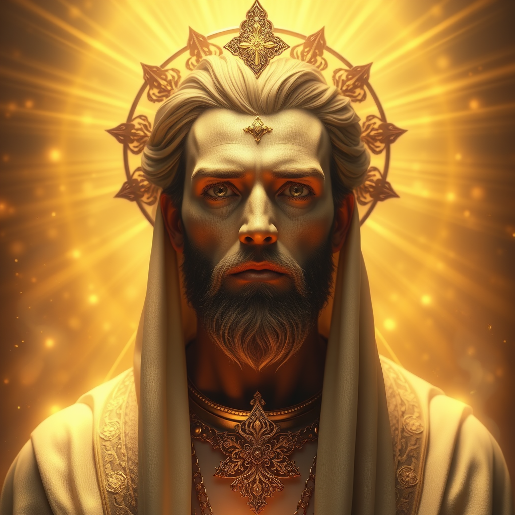 Create a full portrait of a divine priest bathed in holy light, with ultra-quality visuals and intricate details. The priest should have a stunning, beautiful face and perfect anatomy, surrounded by a magical ambiance. Use golden colors to enhance the divine atmosphere on a 3D canvas. Emphasize the sacred and mystical nature of the scene, ensuring a focus on clarity and elegance. Avoid incorporating any elements that might detract from the divinity, such as extra limbs or disfigured features, to maintain a cohesive and captivating portrayal.