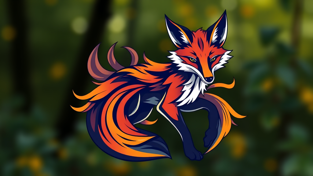 Create a high-definition logo featuring a fox, showcasing intricate details and vibrant colors. The fox should be stylized with flowing lines and dynamic elements that convey a sense of agility and elegance, while maintaining a balance between realism and artistic interpretation. Incorporate subtle natural elements such as leaves or a forest background to enhance the organic feel, and use rich, harmonious colors to add depth and dimension.