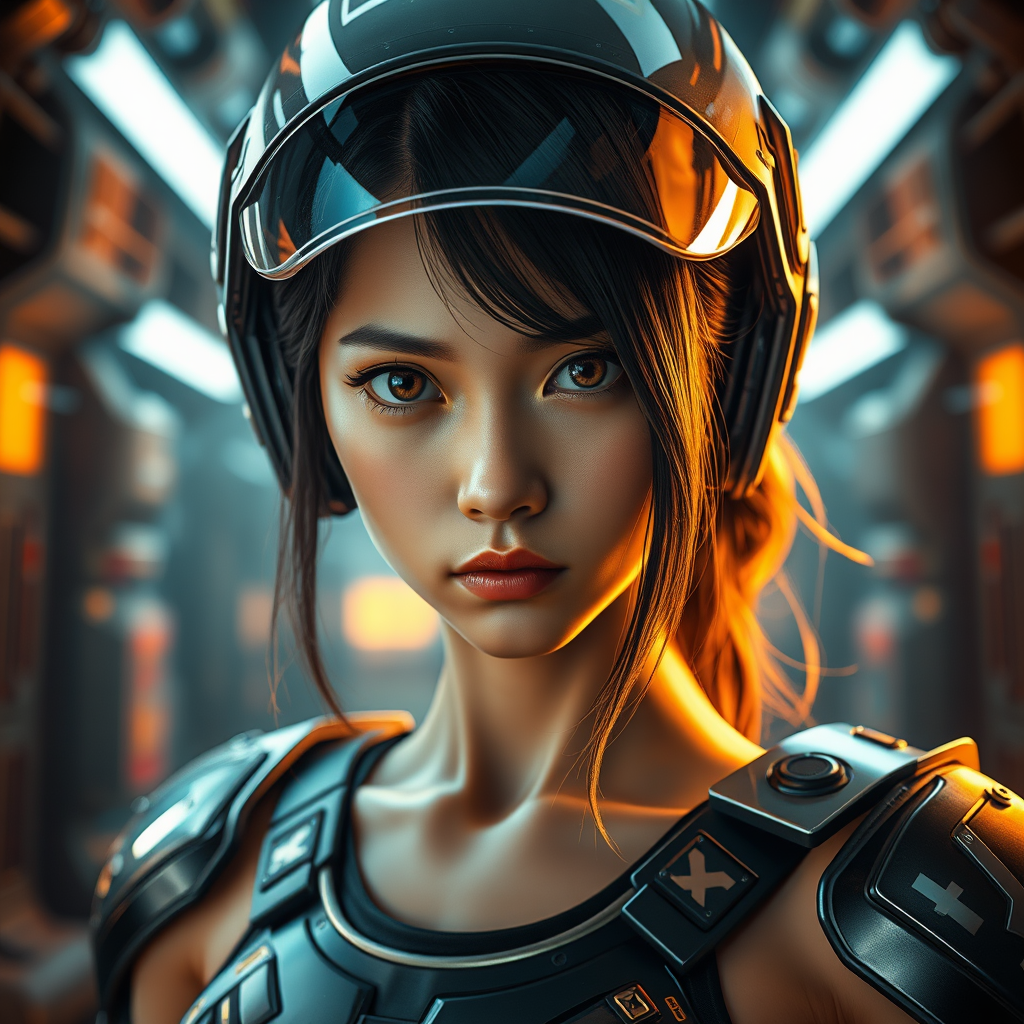 Create a highly detailed and photorealistic full portrait close-up of a girl's face showing a frowning yet innocent expression. Capture her slender, athletic physique in a dynamic action pose, emphasizing her expressive features. She's wearing a sleek combat exo-armor suit with a closed system breathing apparatus, featuring a compact futuristic helmet with a glossy transparent visor and cinematic lighting illuminating her face. The setting is an intricate interior inspired by a sci-fi aesthetic akin to "The Expanse," with neon and volumetric lighting casting dynamic shadows. The shot should be taken with a Canon EOS 5D Mark IV DSLR using settings of aperture f/8, shutter speed 1/250 sec, and ISO 100 to achieve a super detailed, hyper photorealistic effect with natural reflection textures. Highlights include the cinematic lighting on her hair, a bare neck, strands sticking out, and tinted glass elements of her armor. Despite her slim build and narrow hips, she exudes strength, balanced by anime-inspired nuances. The scene glows with bright and golden light, utilizing elements of symmetry and futuristic design. Avoid elements such as bad anatomy, multiple faces or limbs, poor quality, or distortions, ensuring a polished and refined portrayal.