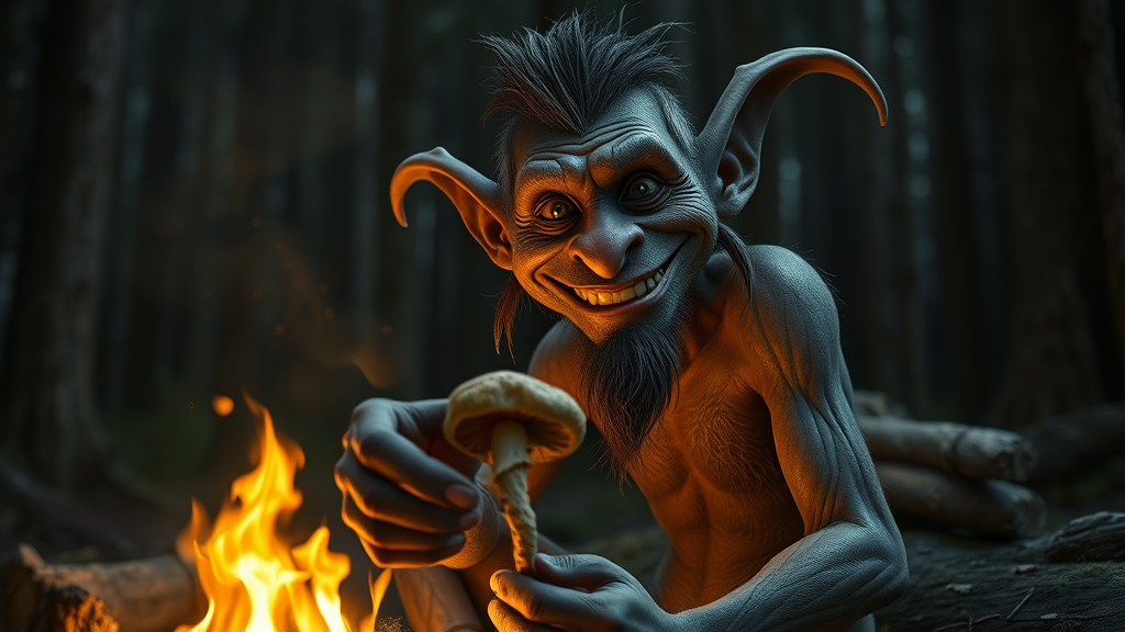 Create a highly detailed fantasy art portrait of a friendly, slim male troll with a humanoid face and long, thin, hanging ears. He is grinning broadly, looking directly into the camera while sitting at a campfire in a dark fir forest. The troll extends a mushroom towards the viewer, invitingly. The scene is a blend of dark fantasy elements with a soft, natural, yet surreal ambiance created by shimmering light particles. The composition utilizes 3D fractals and an octane render, trending in photorealistic concept art. The image captures an 8k artistic photography quality, emphasizing intricate details with soft, volumetrically cinematic lighting. This captivating portrait excludes disfigurements, blurriness, nudity, body hair, or any headgear, ensuring a perfect composition that immerses viewers in a mystical atmosphere.