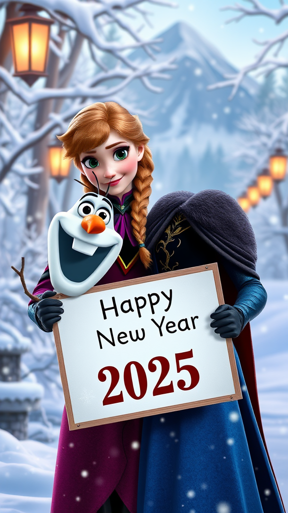Create a highly realistic and enchanting photo of Princess Anna and Olaf from Disney's Frozen. Portray Anna in a bold and daring style, capturing her spirited and adventurous nature. They hold a sign that reads "Happy New Year 2025" amidst an enchanting snowy Arendelle backdrop. Include a softly lit winter forest, shimmering snowflakes, and the warm glow of lanterns. Showcase Anna in a sophisticated, daring version of her iconic outfit, characterized by high shine and modern accents that highlight her confidence and charm. Integrate subtle story details such as her signature pigtails and a glimpse of the North Mountain in the background.