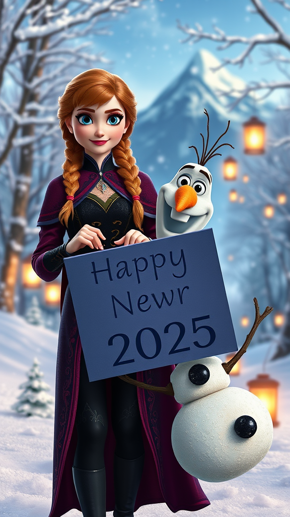 Create a highly realistic and seductive photo of Princess Anna and Olaf from Disney's Frozen. Depict Anna in a bold and daring way, reflecting her spirited and adventurous personality. Anna stands alongside Olaf, holding a sign that reads "Happy New Year 2025". The scene is set against the enchanting snowy landscape of Arendelle, featuring a softly lit winter forest, shimmering snowflakes, and the warm glow of lanterns. Anna wears a sophisticated and slightly daring version of her iconic outfit, crafted in high-shine materials with modern accents that highlight her confidence and charm. Her signature pigtails are styled elegantly, and the North Mountain is subtly visible in the background. Small creative modifications are present, enhancing the core concept while maintaining its essence.