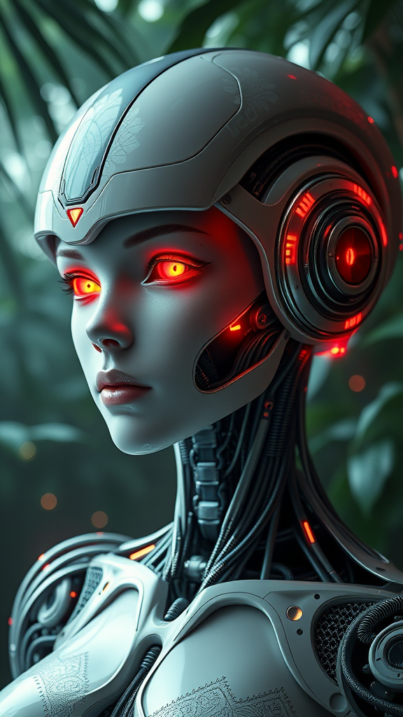 Create a hyper-detailed 3D render of an exquisite porcelain-profile android, showcasing the brilliant fusion of cyborg and robotic elements. Focus on the luxurious cyberpunk aesthetic with intricate latex, rubber, and lace details. The setting is a radiant jungle rain forest, illustrating a future where consciousness transfer into robots is possible. Utilize soft studio lighting and vibrant rim lights to emphasize the robot's elegant features, with visible anatomical details like facial muscles, electric wires, and microchips. The background should be stunningly beautiful, inspired by H. R. Giger's style, and rendered in 8k using octane render for the highest quality. Avoid any blending or distortion of features, ensuring perfect anatomy and smooth integration of mechanical parts, like a silver helmet and carefully detailed body proportions, providing a seamless unity experience. Experiment with the scene's ambiance to add a unique touch, letting the android's identity shine in an otherworldly essence while maintaining a visually stunning masterpiece.