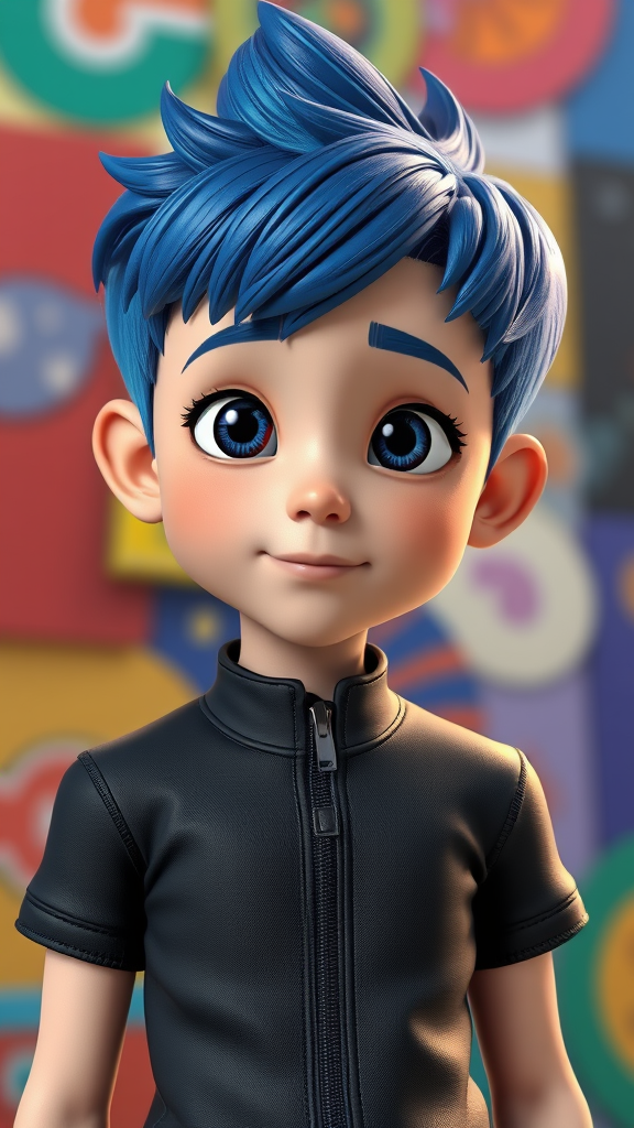 Create a hyper-realistic 3D render in a style reminiscent of a Pixar or Disney animation. The focus is a boy with striking blue hair wearing a sleek black zipper top. The artwork should be rendered in 8k resolution for a highly detailed and polished finish, capturing the whimsical charm typical of a cartoon. The boy's gaze is curious and playful, embodying the essence of youth. His features are harmoniously designed, avoiding exaggerated proportions or distortions. The background and composition should be vibrant with an array of colors, yet cohesive, ensuring the character remains the centerpiece. The artwork should emphasize clean lines, well-defined anatomy, and balanced proportions. Carefully ensuring all elements, from hands to facial expressions, are realistically rendered, this piece maintains the integrity and quality hallmark of professional digital art. Ultimately, this should be a polished and cohesive art piece suitable for video game character design or animated film concept art.