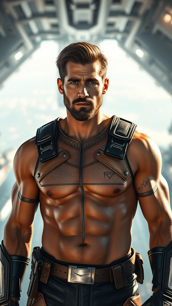 Create a hyper-realistic, full-length portrait of a 28-year-old Israeli male with strikingly dominant and athletic features, emphasizing a muscular physique and a hairy chest. His stature commands attention with a slightly smaller head and shiny, sculpted hair. Set in an expansive spaceport, the scene captures the dramatic moment a sci-fi ship takes off, casting moody natural light across his body. He dons intricately detailed plate leather armor, showcasing texture and craftsmanship, reminiscent of high-quality cinematic shots seen in films like those inspired by Gesaffelstein's 'Pursuit.' The atmosphere is enriched with volumetric lighting, creating an epic, action-packed pose. The photograph brings together vibrant colors and ultra-detailed textures in 8K Ultra-HD, utilizing modern-day cinematic lighting and ray tracing for unparalleled realism. Avoid elements like text, errors, or low-quality distractions.