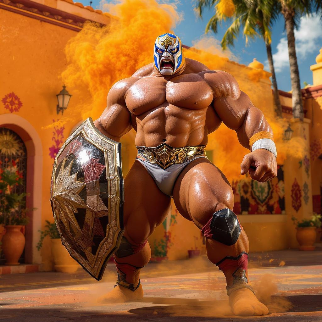 Create a hyper-realistic photograph of El Tigre Braum in a vibrant Mexican-inspired setting, showcasing his towering and muscular physique adorned with an intricately designed luchador mask. Capture the essence of his character with advanced lighting techniques that emphasize his powerful, determined expression and highlight the dynamic pose that conveys both strength and agility. His signature shield should be prominently featured, adding to the dynamic composition. The scene should be filled with a bright and bold color palette featuring splashes of orange and yellow, reflecting his lively and energetic nature.