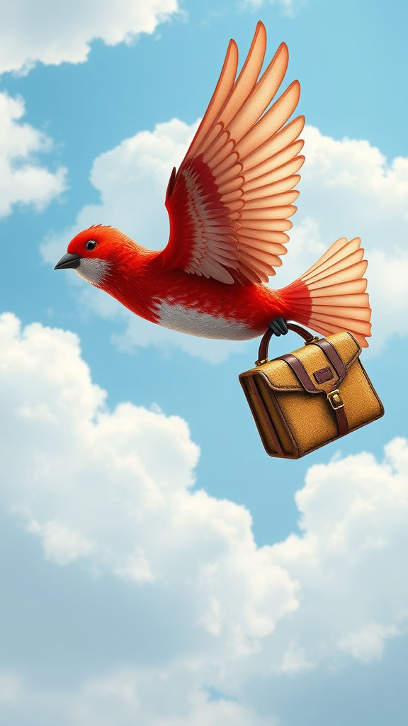 Create a logo for a travel website featuring a vibrant red bird with elegant white wings, gracefully clutching a vintage travel bag. The bird soars against a backdrop of a clear blue sky filled with fluffy white clouds, capturing the essence of freedom and adventure. The design showcases intricate, whimsical details reminiscent of Beatrix Potter's artwork, embracing a cottage core aesthetic with charming, natural elements. Rendered in stunning 8K resolution, the image is highly detailed and presented at a 45-degree angle, offering an immersive visual experience.