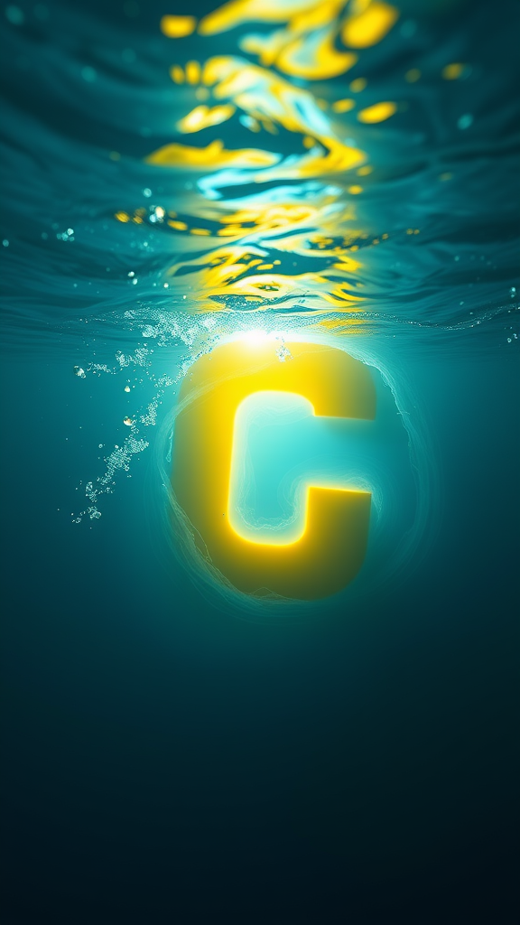 Create a photorealistic 3D render of a stylized letter submerged underwater, blending shades of periwinkle and canary yellow. The scene features swirling water currents and a bright, enigmatic light emanating from the center, creating a high-contrast, eerie atmosphere. The rippling water surface exhibits hyper-detailed liquid textures, enhanced by dramatic lighting, showcasing an ethereal underwater spectacle. Render this in breathtaking 8K resolution with an aspect ratio of 9:16, focusing on the raw, natural beauty of water dynamics and light interaction.