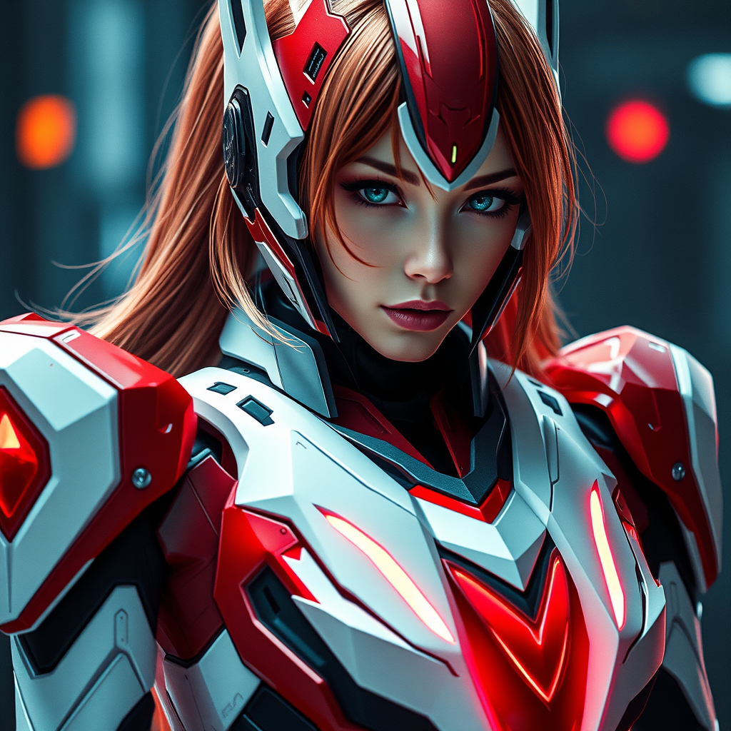 Create a photorealistic and stunning portrait of Asuka Langley dressed in futuristic sci-fi armor. Capture intricate details and the vibrant essence of the character within a 16:9 aspect ratio, exuding a cinematic quality. The armor should balance sleekness with functionality, incorporating advanced design elements that suggest innovation and strength. Maintain a vivid clarity that brings out the rich textures and colors, ensuring a lifelike representation. Keep the atmosphere dynamic and immersive.