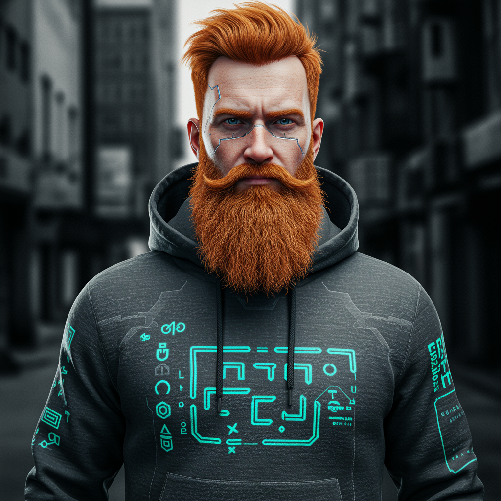 Create a photorealistic image of a 35-year-old man embracing cyberpunk aesthetics. His fiery ginger hair is styled rebelliously, standing out against a monochromatic urban background. His long, meticulously groomed ginger beard boasts detailed texture. Dressed in a gray hoodie with cryptic symbols and neon accents, he pairs it with rugged indigo jeans. His piercing blue eyes and a slightly wry smile capture attention, highlighting his enigmatic character. The use of a Canon EOS 5D Mark IV DSLR camera with an EF 24-70mm f/2.8L II USM lens ensures exceptional detail. Dramatic lighting emphasizes facial features and attire, with a vibrant color palette emphasizing blues, greys, and the striking ginger of his hair and beard. The composition is a full-body shot with him centrally positioned, gazing directly into the camera, slightly conveying a sense of mystery and intrigue.